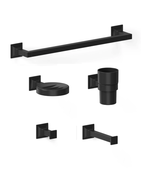 JABONERA, PERCHA, PORTA ROLLO, TOALLERO BARRAL 40 cm, VASO Y PORTAVASO